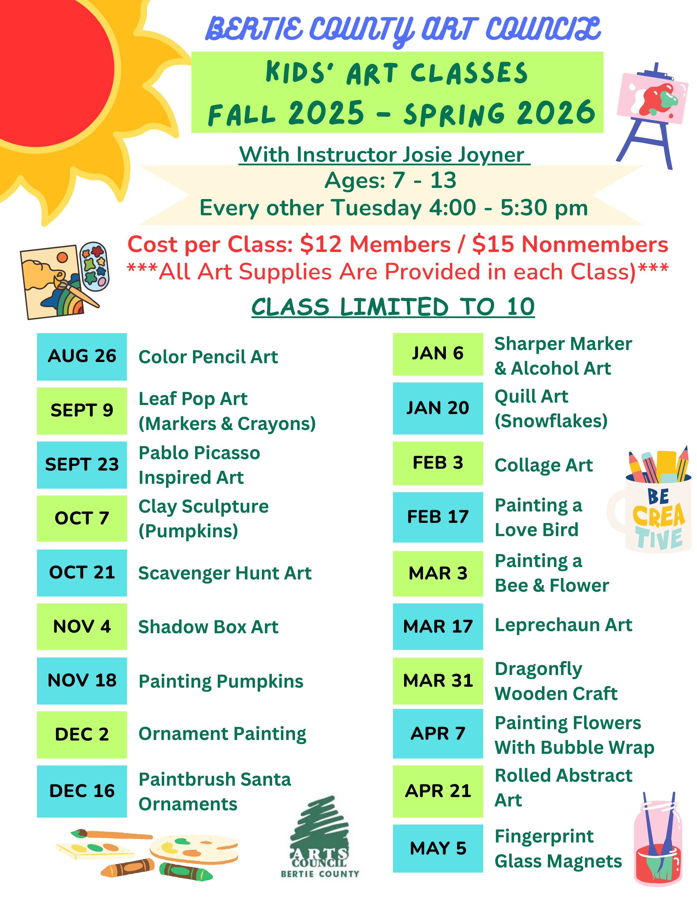 Students must be aged 8-12 years old. Our instructor will be Elizabeth Joyner. Students should come to class wearing clothing they can get messy. A snack will be served during class. To sign up, please call us at 252-794-9402, email us at bertiearts@gmail.com, or visit the gallery on M-F between 10AM-2PM.