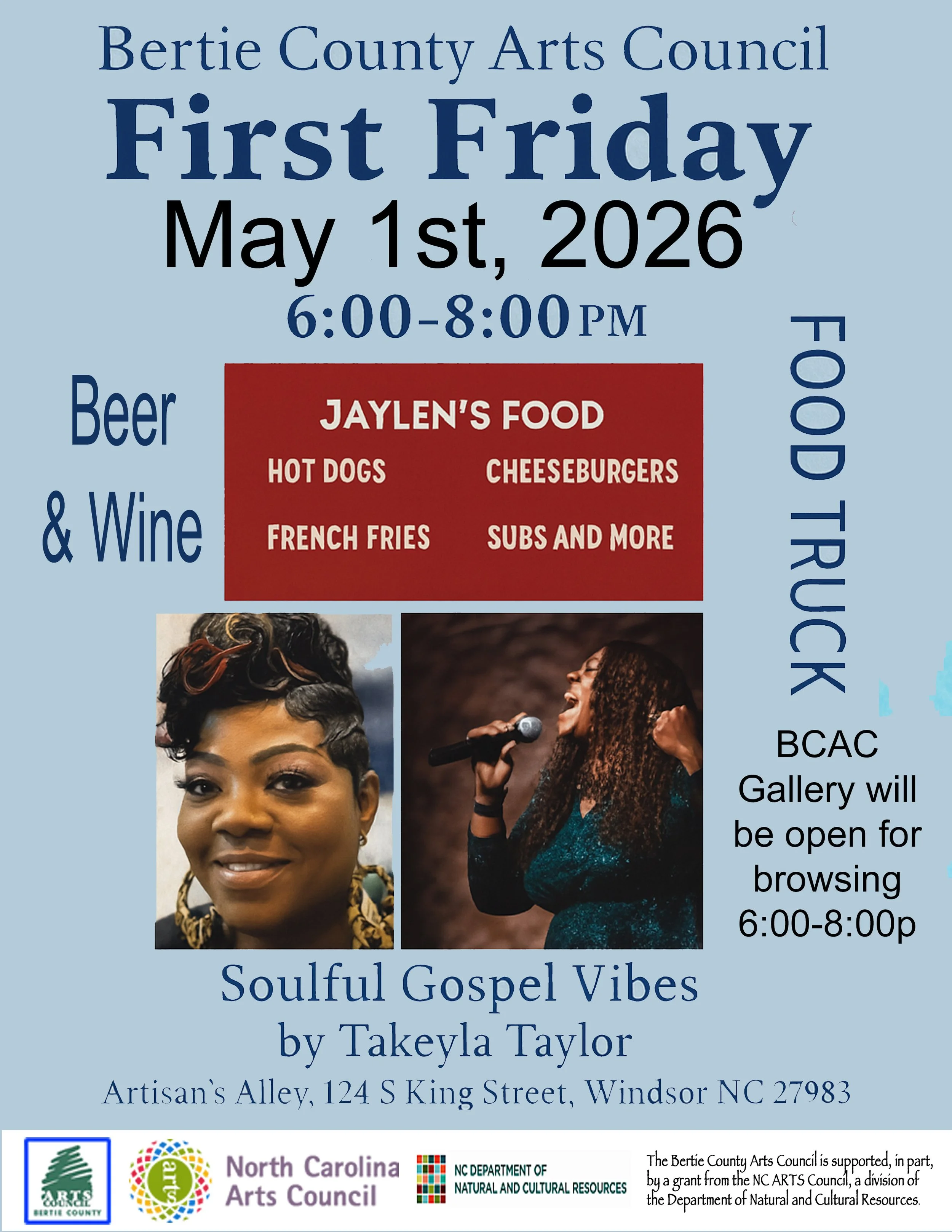 BCAC First Friday for 2026 Friday, May 1, 2026 6:00 PM 8:00 PM 18:00 20:00 Bertie County Arts Council 124 South King Street Windsor, NC 27983 US (map) Google Calendar ICS Please come join us for some great singing by Takeyla Taylor, fellowship with others from the community, excellent food from Jaylen’s Foods, and enjoying the art next door in the BCAC Art Gallery!