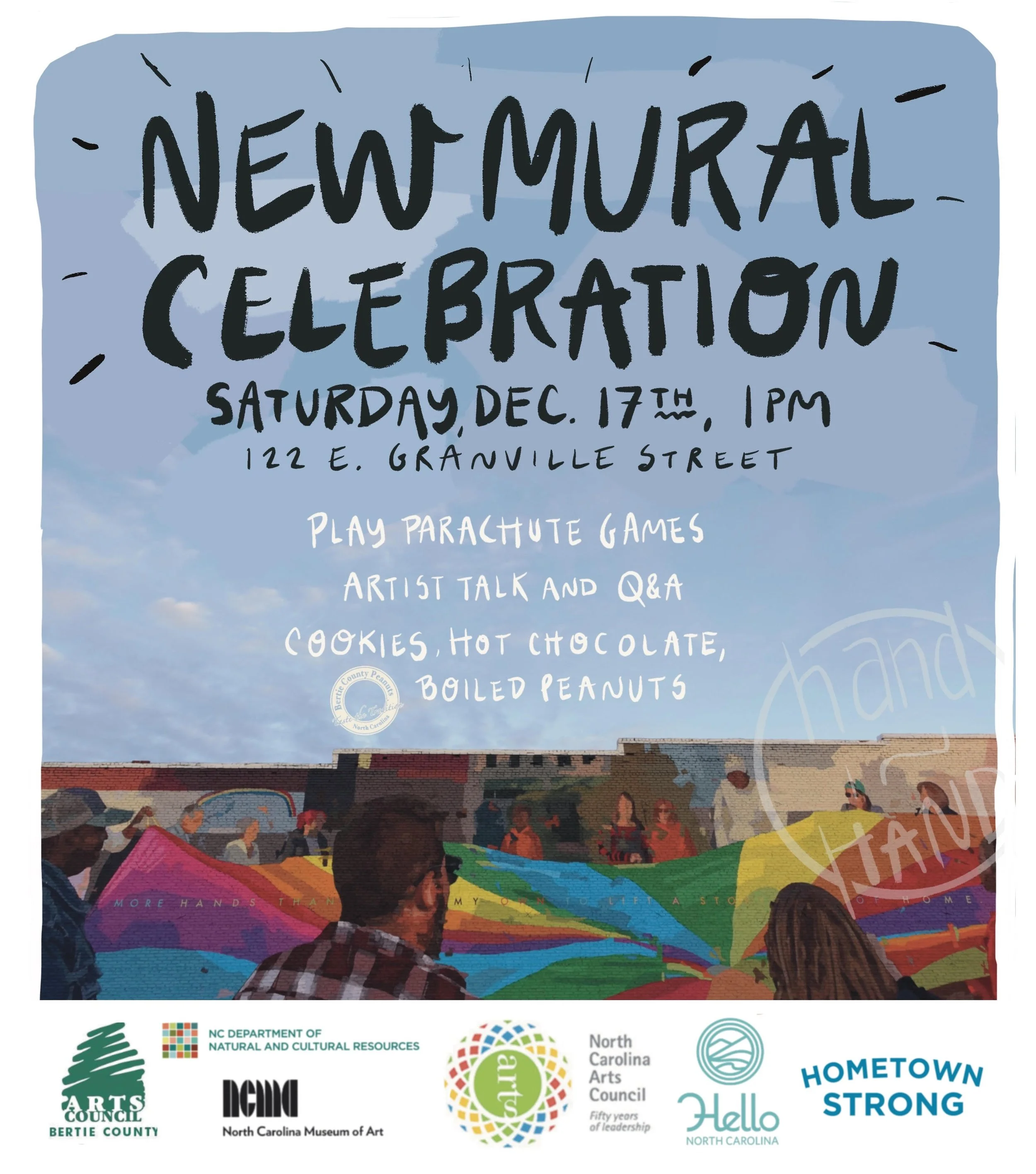 Last Saturday’s Windsor Mural Project kickoff event was a blast! There was a nice turnout and the weather couldn’t have been more perfect. Everyone enjoyed refreshments with neighbors while we got better acquainted with our Hand in Hand Creative mural artists (Andrew & Sarah McWilson) and played parachute games together. This event really set a positive tone for the entire project. It was so nice to gather at the mural site and get a glimpse of what a tremendous asset this outdoor gathering space will eventually become for Bertie County. Big thank you to everyone who came out on October 8th from Bertie County Arts Council as well as our partners and sponsors (links below). We all really appreciate your support and shared enthusiasm! We are planning several more Windsor Mural Project community events, so please stay tuned to our newsletter, website, and social media feeds for the latest info. See you all again soon!